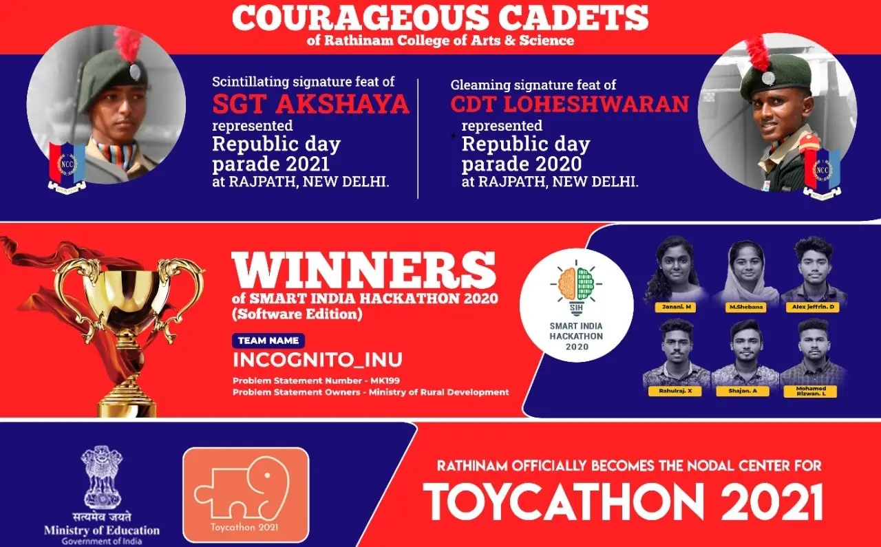 Rathinam Group of Institutions has been thrived its layers in the education pitch, with its outstanding academia. We are the India’s leading institution in Innovation, Incubation and Industry Collaborations. We ranked among the top in NIRF, ARIIA, INSTITUTIONS INNOVATION COUNCIL, THE WEEK, OUTLOOK, TIMES OF INDIA & INDIA TODAY.